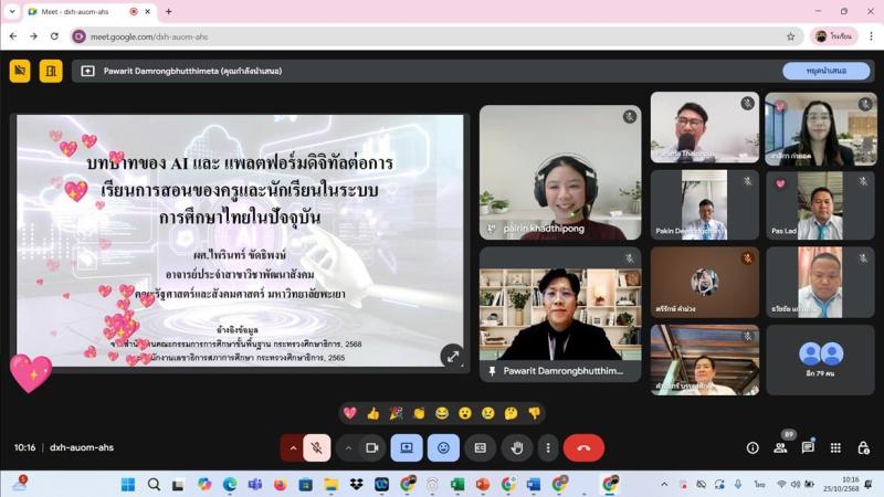วันที่ 25 ตุลาคม 2568 หลักสูตรรัฐประศาสนศาสตรบัณฑิต สาขาวิชารัฐประศาสนศาสตร์ ร่วมกับ หลักสูตรเทคโนโลยีบัณฑิต สาขาวิชาธุรกิจวิศวกรรม จัดโครงการสัมมนาทางวิชาการ เรื่อง “บทบาทของ AI และแพลตฟอร์มดิจิทัลต่อการเรียนการสอนของครูและนักเรียนในระบบการศึกษาของไทย” ผ่านระบบออนไลน์ Google Meet ก่อนเริ่มการสัมมนา คณะผู้จัดโครงการและผู้เข้าร่วมสัมมนาได้ร่วมกัน ถวายความอาลัยแด่สมเด็จพระนางเจ้าสิริกิติ์ พระบรมราชินีนาถ พระบรมราชชนนีพันปีหลวง โดยร่วมกันสงบนิ่ง เพื่อรำลึกในพระมหากรุณาธิคุณอันหาที่สุดมิได้ จากนั้นเข้าสู่พิธีเปิดโครงการ โดยได้รับเกียรติจาก ผู้ช่วยศาสตราจารย์สาลิกา ก๋ายอด เลขานุการคณะวิทยาการจัดการ ปฏิบัติหน้าที่แทนผู้บริหาร เป็นประธานในพิธีเปิด ทั้งนี้ได้รับเกียรติจาก ผู้ช่วยศาสตราจารย์ไพรินทร์ ขัดธิพงษ์ อาจารย์ประจำหลักสูตรศิลปศาสตรบัณฑิต สาขาวิชาพัฒนาสังคม คณะรัฐศาสตร์และสังคมศาสตร์ มหาวิทยาลัยพะเยา เป็นวิทยากรบรรยาย และมี อาจารย์ปวริศร์ ดำรงพุฒิเมธา อาจารย์ผู้รับผิดชอบรายวิชา ทำหน้าที่ผู้ดำเนินรายการ การจัดสัมมนาครั้งนี้มีวัตถุประสงค์เพื่อเสริมสร้างความรู้ ความเข้าใจเกี่ยวกับการนำเทคโนโลยีปัญญาประดิษฐ์ (AI) และแพลตฟอร์มดิจิทัลมาประยุกต์ใช้ในกระบวนการเรียนการสอน ตลอดจนเปิดโอกาสให้นักศึกษาได้แลกเปลี่ยนความคิดเห็นและประสบการณ์จากผู้ทรงคุณวุฒิในสาขาที่เกี่ยวข้อง