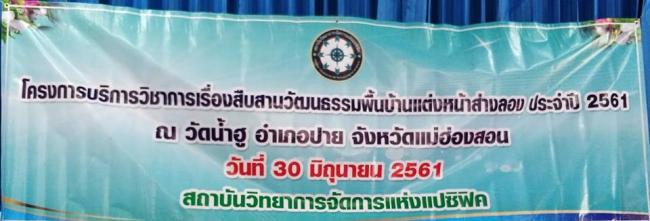 ดร.สุรเจต ไชยพันธ์พงษ์ อธิการบดีสถาบันวิทยาการจัดการแห่งแปซิฟิค ประธานในพิธีเปิดโครงการสืบสานวัฒนธรรมพื้นบ้านแต่งหน้าส่างลอง พร้อมด้วยคณาจารย์และนักศึกษา สถาบันวิทยาการจัดการแห่งแปซิฟิค ร่วมจัดโครงการดังกล่าว เพื่อสืบสานวัฒนธรรมพื้นบ้าน ณ วัดน้ำฮู อำเภอปาย จังหวัดแม่ฮ่องสอน โดยมีนักเรียน นักศึกษาผู้นำชุมชนตลอดจนผู้มีความสนใจภายในชุมชนเข้าร่วมโครงการในครั้งนี้