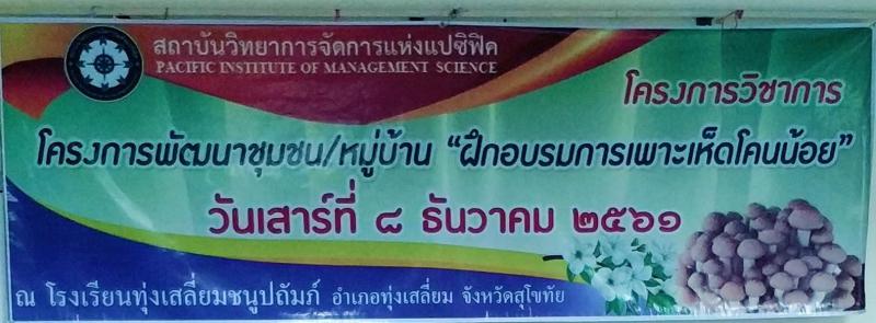 ดร.สุรเจต ไชยพันธ์พงษ์ อธิการบดี สถาบันวิทยาการจัดการแห่งแปซิฟิค จังหวัดพะเยา เป็นประธานในพิธีเปิดโครงการบริการวิชาการพัฒนาชุมชนและหมู่บ้าน "โครงการฝึกอบรมเชิงปฏิบัติการ การเพาะเห็ดโคนน้อย" ณ โรงเรียนทุ่งเสลี่ยมชนูปถัมภ์ อ.ทุ่งเสลี่ยม จ.สุโขทัย วันเสาร์ที่ 8 ธันวาคม 2561