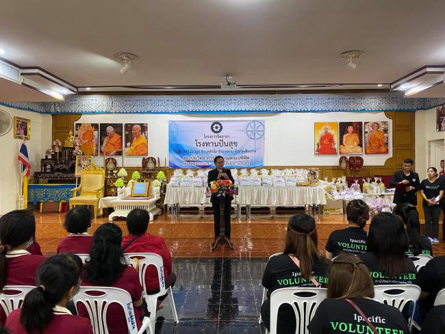 ผู้ช่วยศาสตราจารย์ ดร.พีระ พันธุ์งาม รองอธิการบดี สถาบันวิทยาการจัดการแห่งแปซิฟิค เป็นประธานในพิธีการเปิด โครงการจิตอาสา โรงทานปันสุข ประจำปีการศึกษา 2562 วันที่ 15 สิงหาคม 2563 ณ วัดศรีเมืองมูล ตำบลหัวง้ม อำเภอพาน จังหวัดเชียงราย