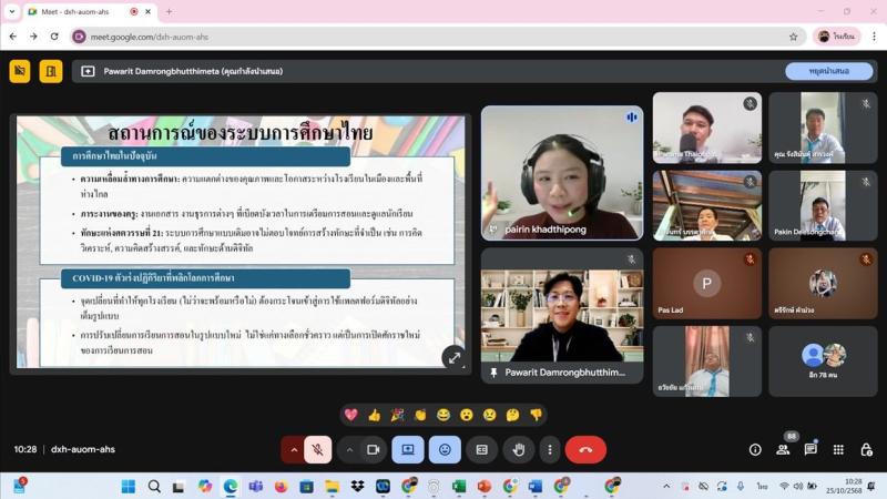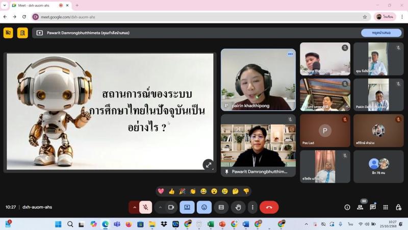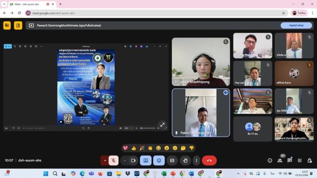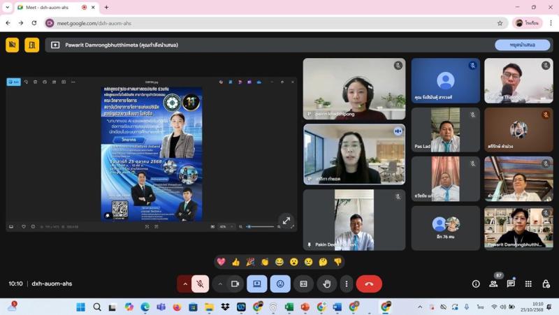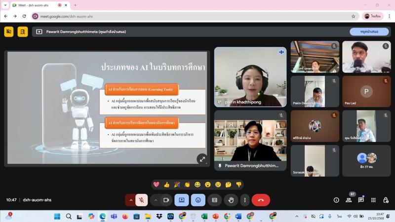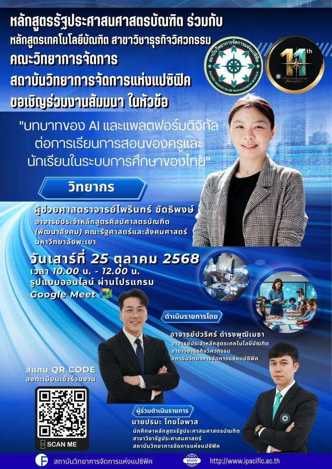วันที่ 25 ตุลาคม 2568 หลักสูตรรัฐประศาสนศาสตรบัณฑิต สาขาวิชารัฐประศาสนศาสตร์ ร่วมกับ หลักสูตรเทคโนโลยีบัณฑิต สาขาวิชาธุรกิจวิศวกรรม จัดโครงการสัมมนาทางวิชาการ เรื่อง “บทบาทของ AI และแพลตฟอร์มดิจิทัลต่อการเรียนการสอนของครูและนักเรียนในระบบการศึกษาของไทย” ผ่านระบบออนไลน์ Google Meet ก่อนเริ่มการสัมมนา คณะผู้จัดโครงการและผู้เข้าร่วมสัมมนาได้ร่วมกัน ถวายความอาลัยแด่สมเด็จพระนางเจ้าสิริกิติ์ พระบรมราชินีนาถ พระบรมราชชนนีพันปีหลวง โดยร่วมกันสงบนิ่ง เพื่อรำลึกในพระมหากรุณาธิคุณอันหาที่สุดมิได้ จากนั้นเข้าสู่พิธีเปิดโครงการ โดยได้รับเกียรติจาก ผู้ช่วยศาสตราจารย์สาลิกา ก๋ายอด เลขานุการคณะวิทยาการจัดการ ปฏิบัติหน้าที่แทนผู้บริหาร เป็นประธานในพิธีเปิด ทั้งนี้ได้รับเกียรติจาก ผู้ช่วยศาสตราจารย์ไพรินทร์ ขัดธิพงษ์ อาจารย์ประจำหลักสูตรศิลปศาสตรบัณฑิต สาขาวิชาพัฒนาสังคม คณะรัฐศาสตร์และสังคมศาสตร์ มหาวิทยาลัยพะเยา เป็นวิทยากรบรรยาย และมี อาจารย์ปวริศร์ ดำรงพุฒิเมธา อาจารย์ผู้รับผิดชอบรายวิชา ทำหน้าที่ผู้ดำเนินรายการ การจัดสัมมนาครั้งนี้มีวัตถุประสงค์เพื่อเสริมสร้างความรู้ ความเข้าใจเกี่ยวกับการนำเทคโนโลยีปัญญาประดิษฐ์ (AI) และแพลตฟอร์มดิจิทัลมาประยุกต์ใช้ในกระบวนการเรียนการสอน ตลอดจนเปิดโอกาสให้นักศึกษาได้แลกเปลี่ยนความคิดเห็นและประสบการณ์จากผู้ทรงคุณวุฒิในสาขาที่เกี่ยวข้อง